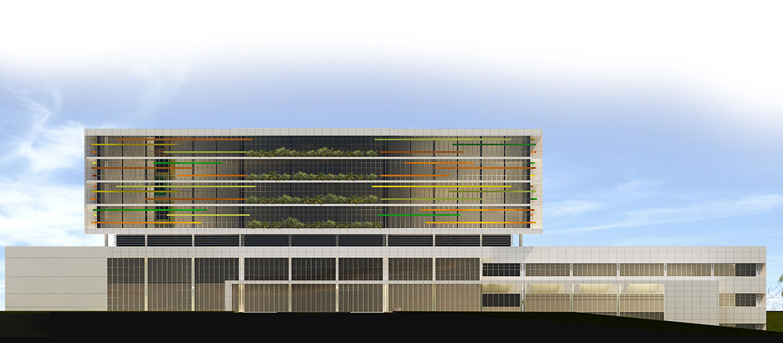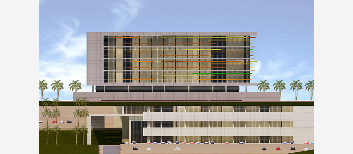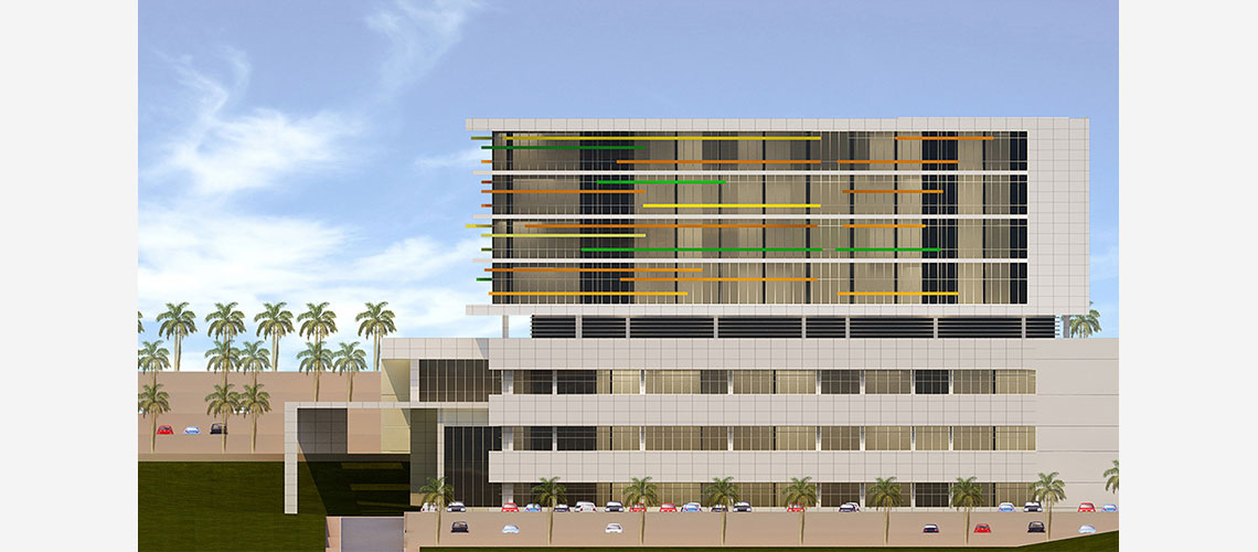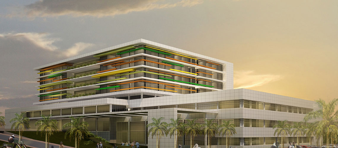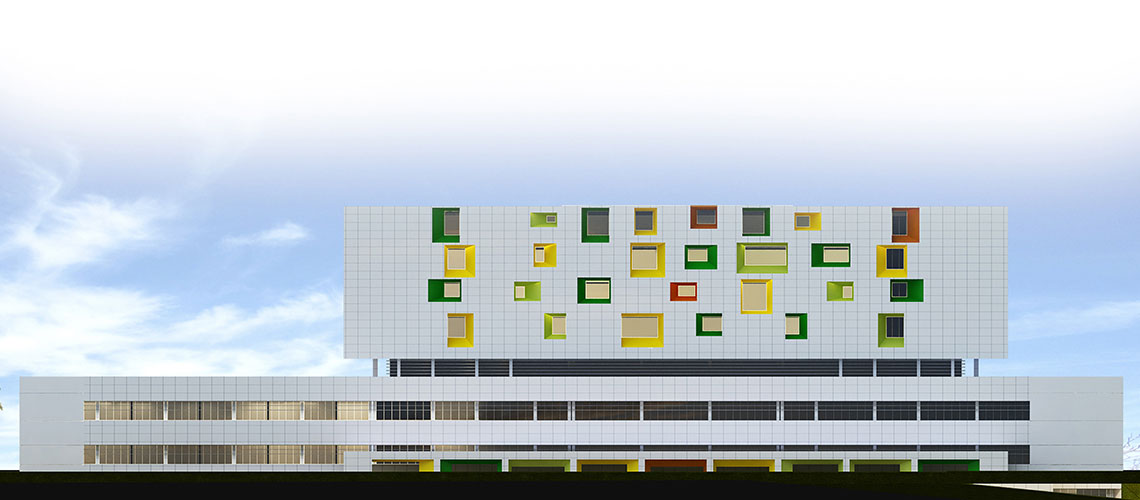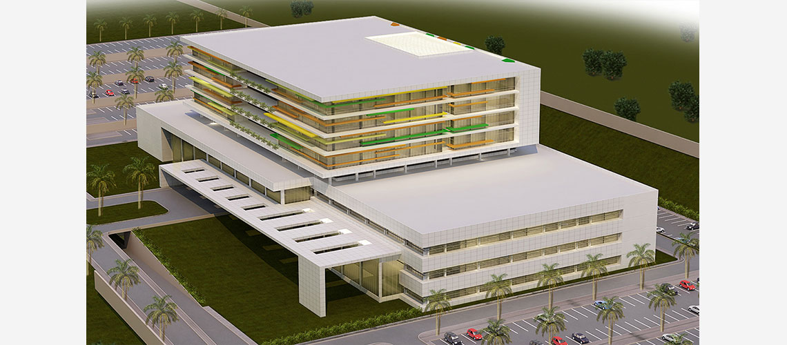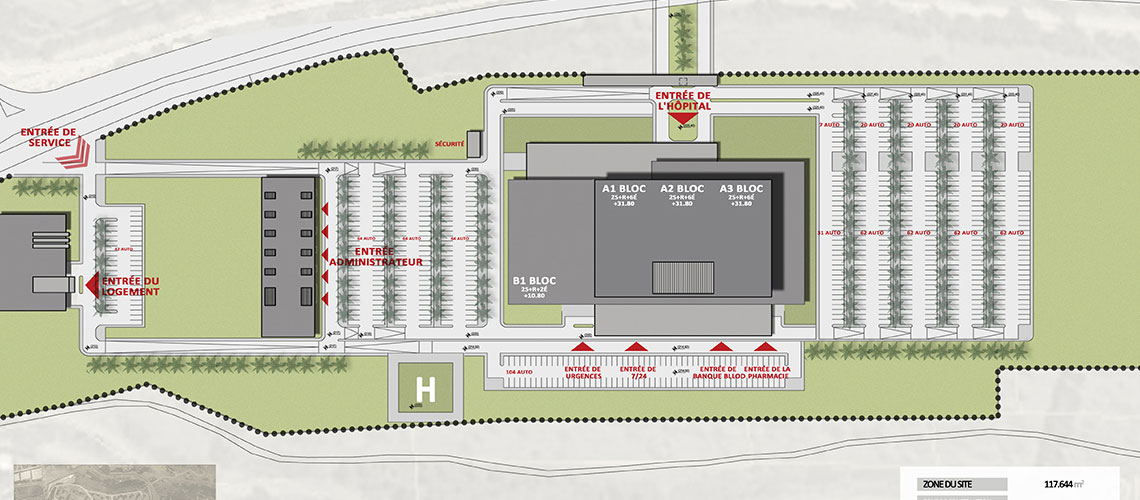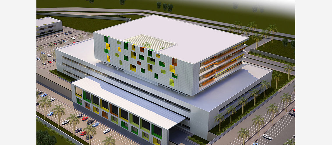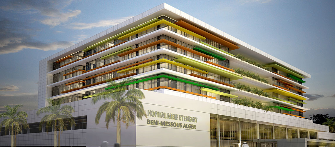 Proje Cezayir’de 117.000 m2’lik bir alanda tasarlanmıştır. Kampüste kadın doğum ve çocuk hastanesi, idari bina ve apart otel bulunmaktadır. Hastane bloğu eğimli bir araziye konumlandırılmıştır. Farklı kotlarda girişler sağlanarak arazi ile ilişki kurulmuştur. Hastanenin acil servis, eczane, kan bankası girişleri arka cepheden ve alt kottan, ana giriş ise üst zemin kattan ve ön cepheden sağlanmaktadır. Bu katlar birbirine galeri boşluklarıyla bağlanarak ana girişin hacim kazanması sağlanmıştır. Atrium alanında poliklinik bölümünün bekleme alanları bulunur. Ana çekirdek binanın merkezinde yer alır ve önündeki geniş holler bina çeperine kadar uzanarak dış çevre ile bağlantı kurulmuştur. Bu sayede bina içinde konumlanma ve yön belirleme kolaylaşmaktadır. Üst katlatdaki servis bölümü merkezi çekirdekle birbirine bağlanmış iki blok şeklinde planlanmıştır. Alttaki baza kütlesinin çatısı hasta yatak odalarının başladığı katta şifa bahçesi olarak kullanılmaktadır. Şifa bahçesi medikal personelin kontrolünde hastaların kullanması için planlanmıştır. Çocuk hastanesi olması fikri cephe karakterine de yansıtılmış, monotonluktan uzak, renkli ve eğlenceli cephe dili kullanılmıştır. Cephelerde ayrıca yön farkı gözetilerek kuzey cepheler geçirgen ve hafif, güney cepheler ise sağır ve kapalı tasarlanmıştır.