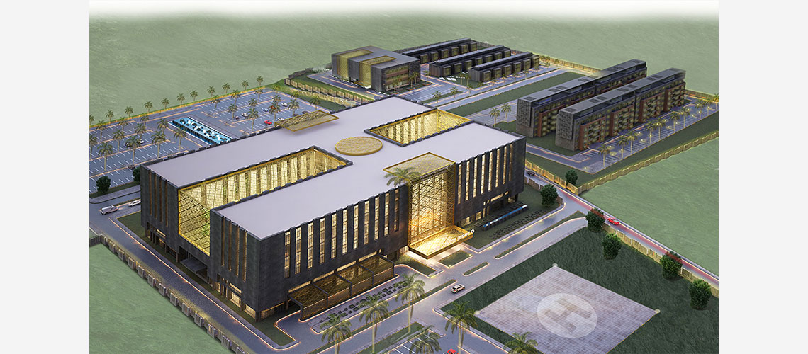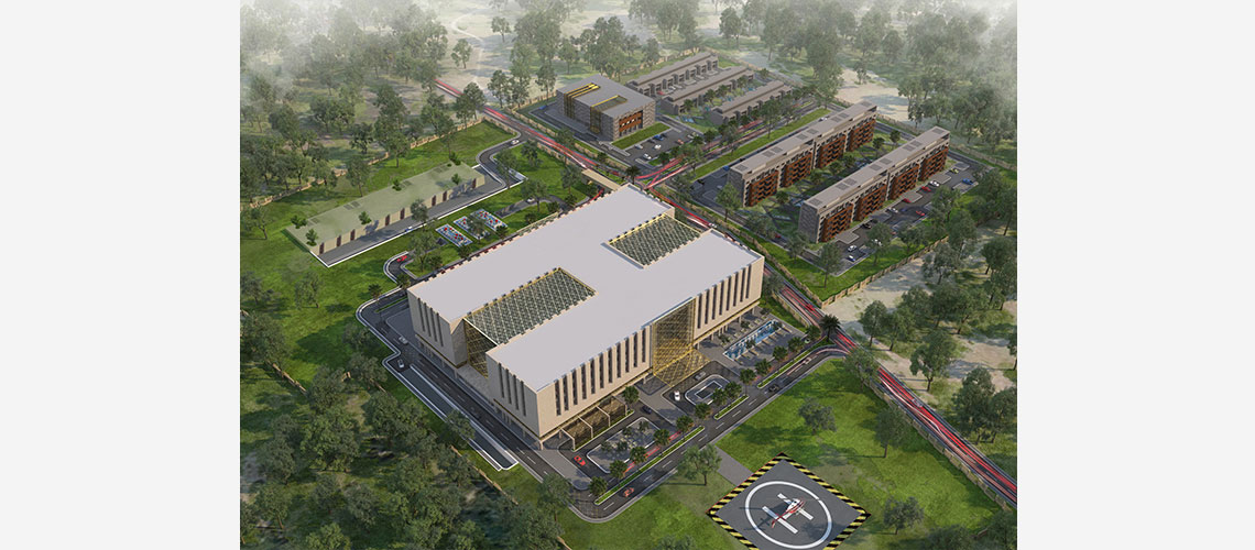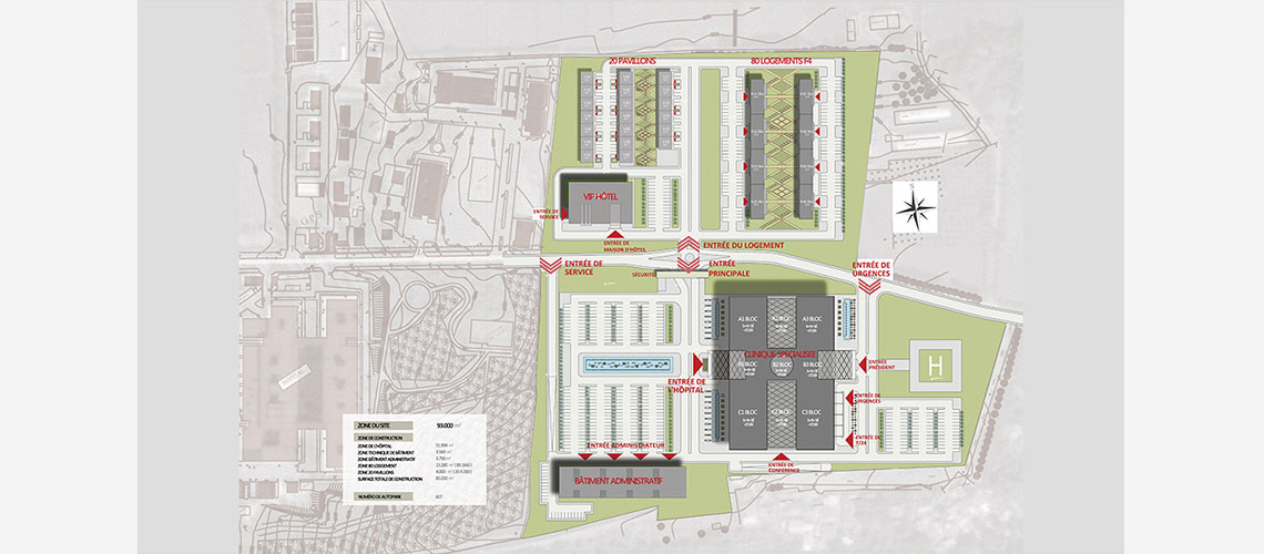 Proje; 120 yataklı bir hastane, idari bina, VIP apart otel, 80 birimlik konut blokları ve 20 adet villadan oluşan 130.000 m2 ‘lik bir araziye sahip bir yerleşimdir. En önemli bina olan hastane bloğu 120 yatak kapasitesinde, eğitim fonksiyonunu da barındıran kompakt bir yapıdır. Bu yapı alt kotlarda teşhis, tedavi, ameliyathane ve acil servis birimlerini, üst kotlarda ise servis katlarını barındırır. Kompakt bir kütle formuna sahip yapı, merkezi noktada bulunan geniş atriumla ve cepheden bu atriuma kadar uzanan galeri boşluklarıyla net ve kolay okunabilen bir plan organizasyonuna sahiptir. Bu iç boşluklar asansör ve merdiven gruplarının etrafında düzenlenmesiyle hastanenin bütün birimlerini ve aralarındaki sirkülasyonu sağlayan dolaşım ağını örgütler. Böylece bu iç boşluklar yapının iç mekan kalitesini belirlemenin yanı sıra, karmaşık hastane işleyişinin basit plan şemasıyla çözümlenmesini sağlar. Hastane kütlesinde yapılan bu boşaltmalar, kullanıcı konforunu artıran zengin iç mekanları, bekleme alanlarını ve ziyaretçi lobilerini oluşturur.